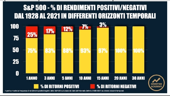 Lo sapevate che negli ultimi 100 anni circa l’indice azionario americano S&P 500 se lo si è detenuto tra alti e bassi mediamente per 5 anni ha nel 88% dei casi prodotto rendimenti positivi, a 10 anni nel 93% casi, a 15 anni nel 97% dei casi e addirittura detenere azioni 20 o più anni mediamente storicamente ha portato a guadagnare nel 100% dei casi?